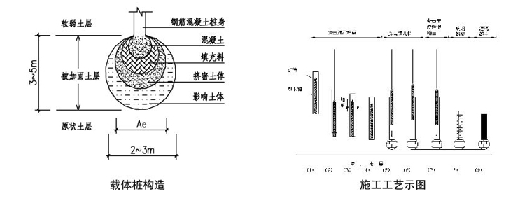 1. 載體樁是采用細(xì)長錘夯擊成孔,將護(hù)筒沉到設(shè)計(jì)標(biāo)高(進(jìn)入選定持力層)后,細(xì)長錘擊出護(hù)筒底一定的深度,分批向孔內(nèi)投入干硬性混凝土,用細(xì)長錘反復(fù)夯擊擠密,并用三擊貫入度作為控制指標(biāo),通過填料夯擊使樁端以下深度3-5米的土體得到有效的加固擠密;形成自上而下由干硬性混凝土、擠密土體和影響土體組成的復(fù)合載體,最后放置鋼筋籠,灌注樁身混凝土而形成的樁。從受力上分析,載體相當(dāng)于等效擴(kuò)展基礎(chǔ)。